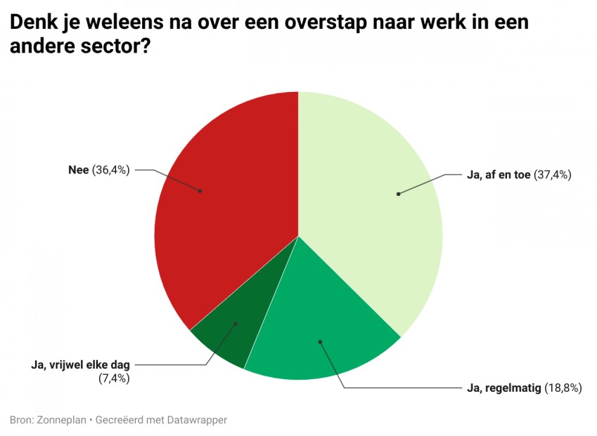 Om de energietransitie te doen slagen is personeel nodig. Met name technische vakmensen kunnen de komende decennia het verschil maken, maar er is een tekort. Energiebedrijf Zonneplan vroeg daarom aan een panel van duizend werkende Nederlanders of zij weleens nadenken over een overstap naar werk in een andere sector. Twee op de drie gaven aan dat dit inderdaad het geval is. Meer dan de helft zegt bovendien veel waarde te hechten aan maatschappelijk relevantie in hun werk.
